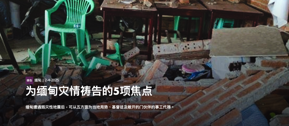 当国家深陷创伤之际,求主使用祂的儿女活出盐和光的见证,让世人从信徒的良善与盼望中看到福音的真实。愿缅甸教会在此次灾难中,成为基督施恩的管道。